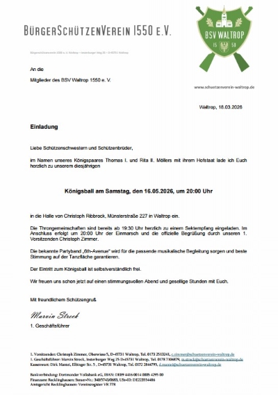 das amtierende Königspaar Thomas I. und Rita II. Möllers lädt euch herzlich zu seinem Königsball am Samstag, dem 16. Mai um 20 Uhr in die Halle von Christoph Ribbrock, Münsterstraße 227 in Waltrop ein.